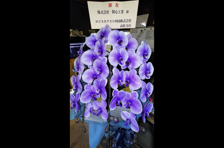 資材ヤード完成のお祝いに、会社カラーの紫色の胡蝶蘭をいただきました!